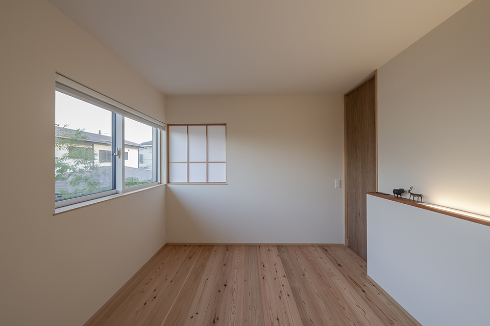 キッチン横のタタミスペースは普段は建具を引き込んで使用し、料理中でもお子さまのお昼寝を見守ることができます。天井にサツマのヨシベニヤを使用することで温かみのある優しい雰囲気の空間となりました。また奥には床を彫り込んだ文机もあり、小さな書斎としても使うことができます。