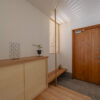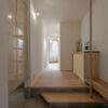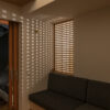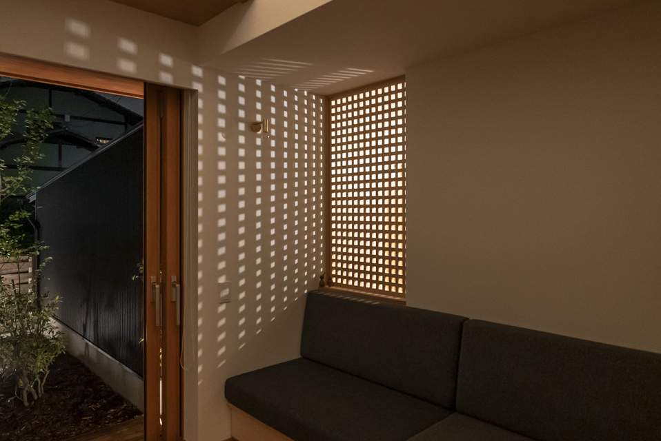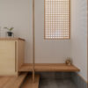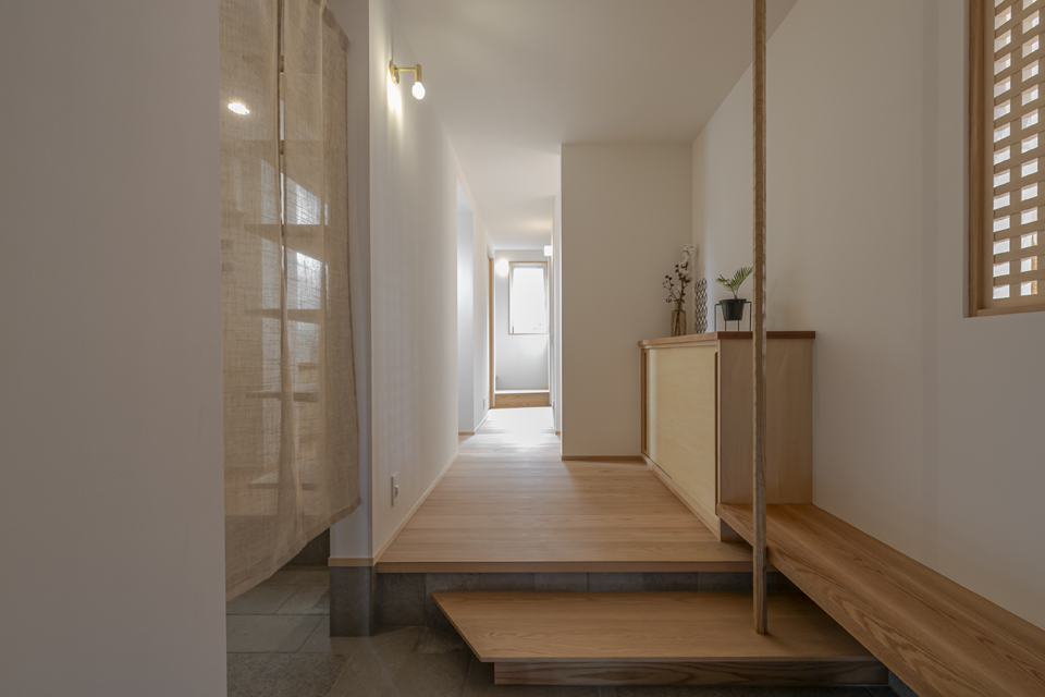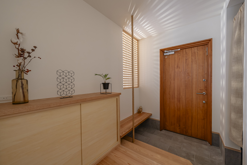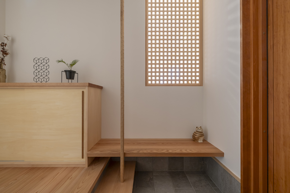隣接するリビングからの光が格子越しに広がり、玄関に柔らかな明るさを届けます。