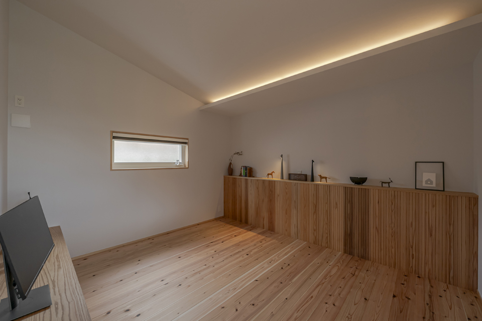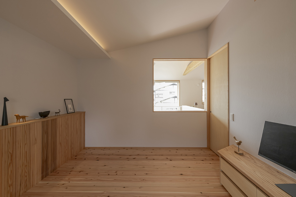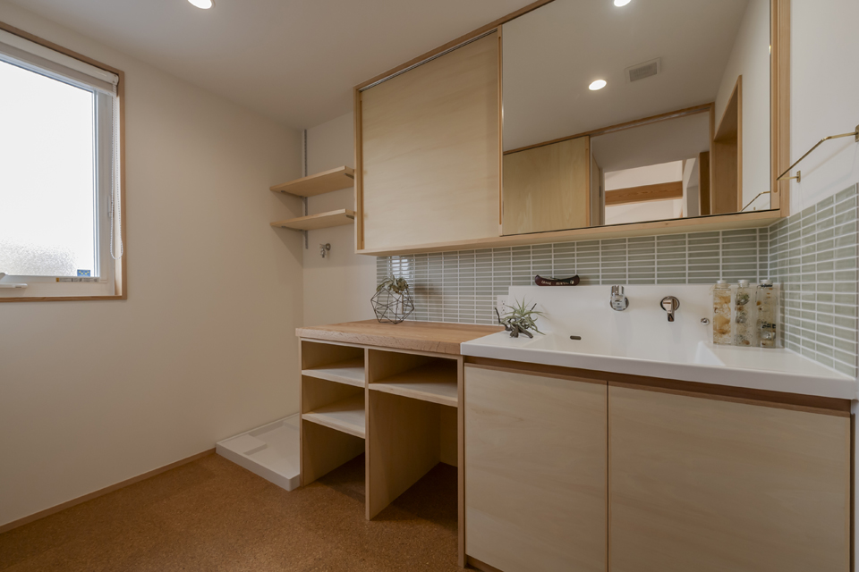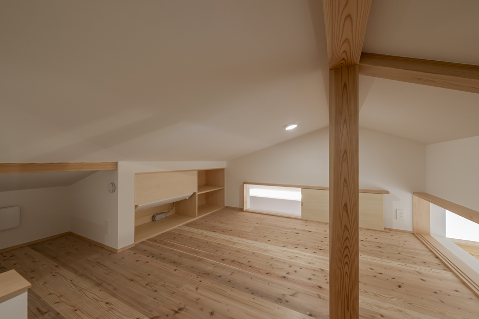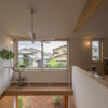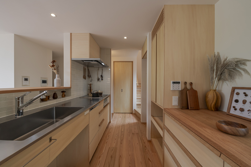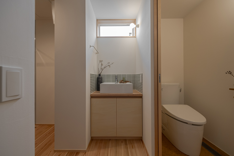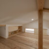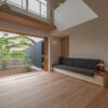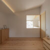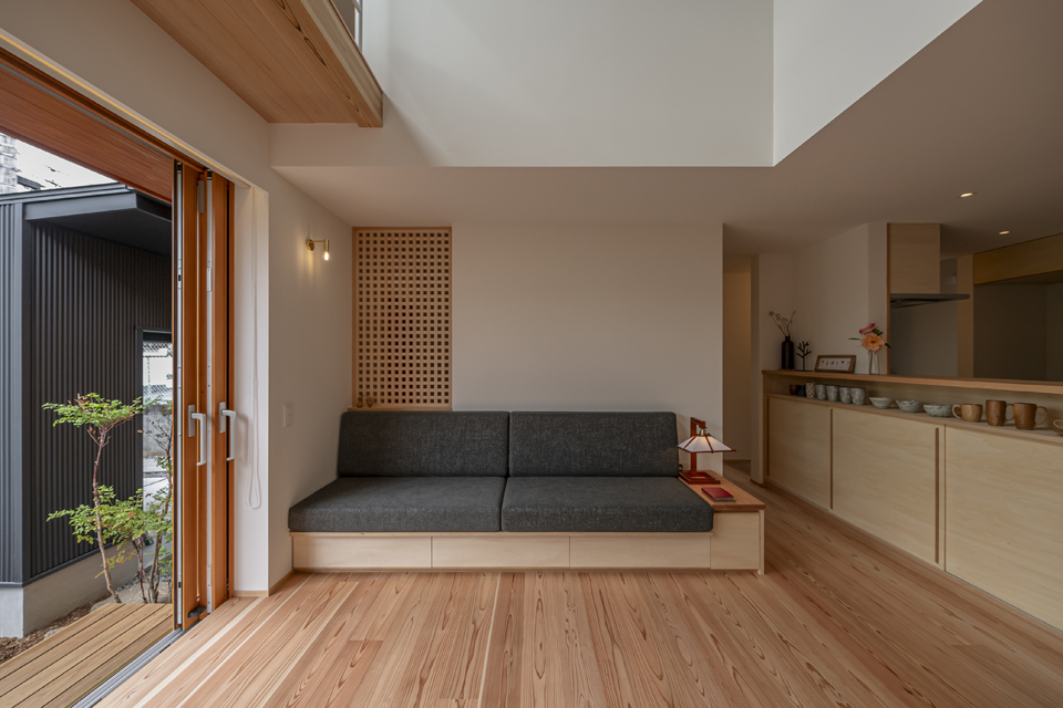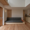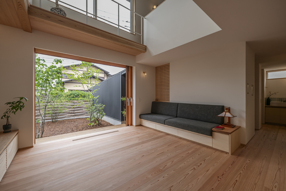 ゆったりと座れる造作ソファ、2本引き込みの大開口木製サッシ、南東側の天井に貼られた栂(つが)など、素材の持ち味に加えて庭の緑を望むことができ、家の中にいながら外の自然とつながる、穏やかな時間が流れます。2階には寝室のほか、洗面脱衣室・浴室・ウォークインクローゼットを近接させ、家事がスムーズにこなせる効率的な動線を実現。