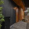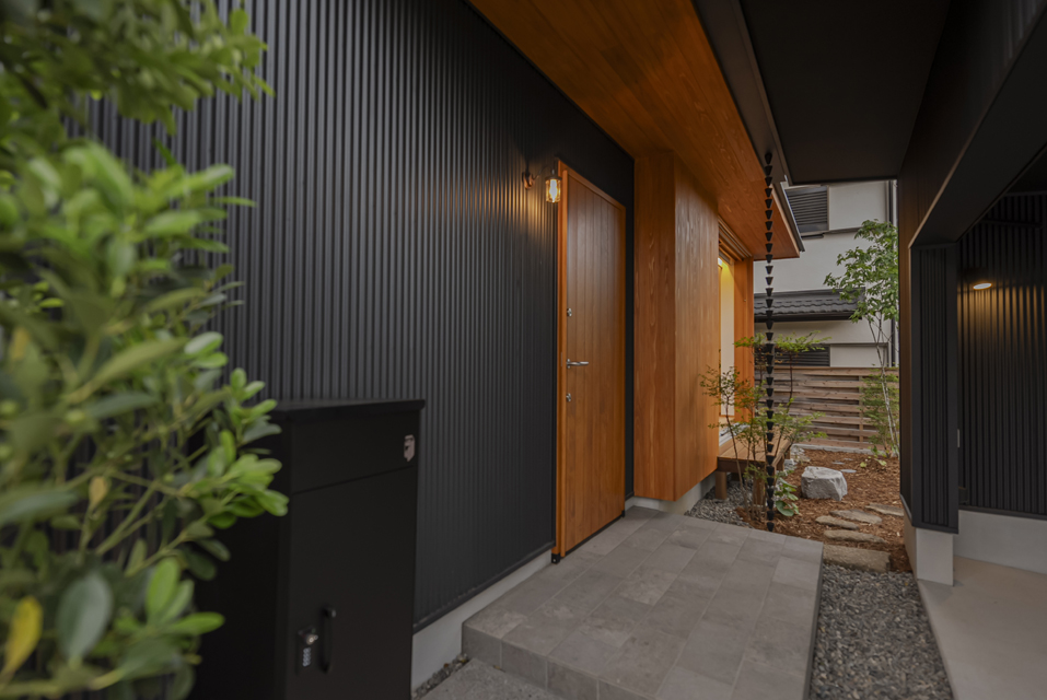 「羽重」という名には、仲睦まじいご家族が穏やかな時間を重ねていく姿をイメージしました。奇をてらわず、日々の暮らしに自然と馴染むこと。シンプルでありながら心地よく、上質な空間を目指しました。外観はブラックのガルバリウム鋼板を基調に、木部の鮮やかな色味をアクセントにしています。玄関庇とゆるやかにつながる大屋根のガレージは、雨の日でも濡れずに玄関ポーチへとアプローチできる設計。シャープな印象の中に、木の温もりが際立つバランスの取れた佇まいです。