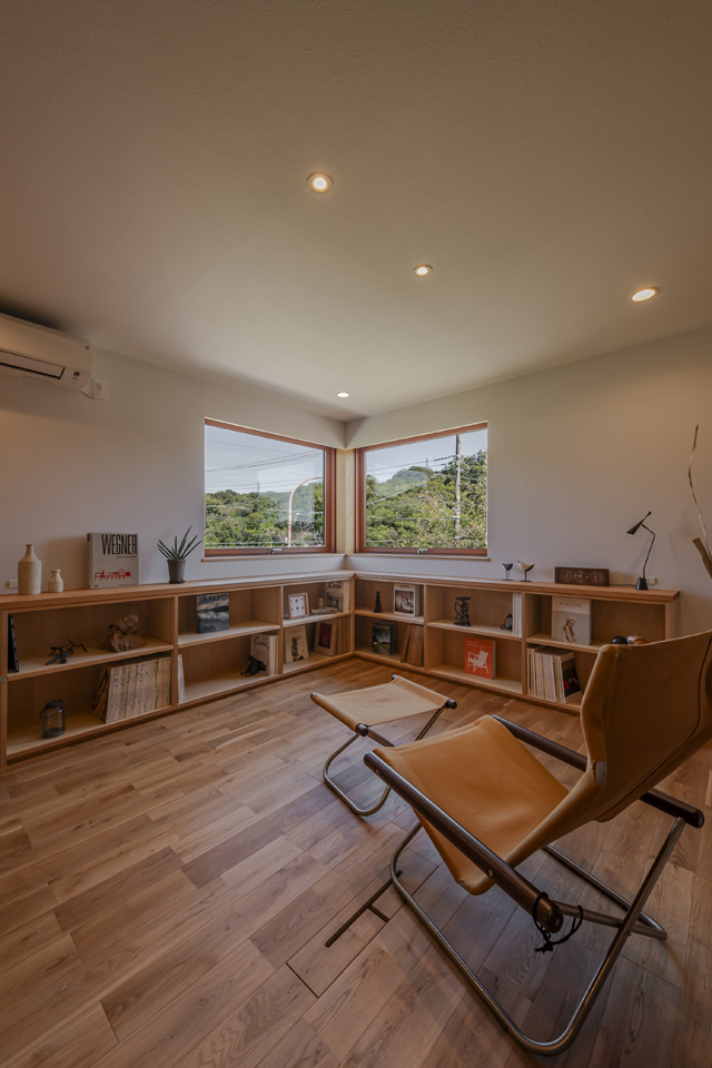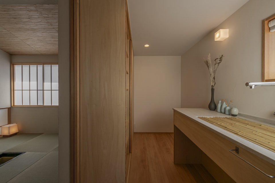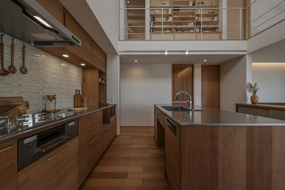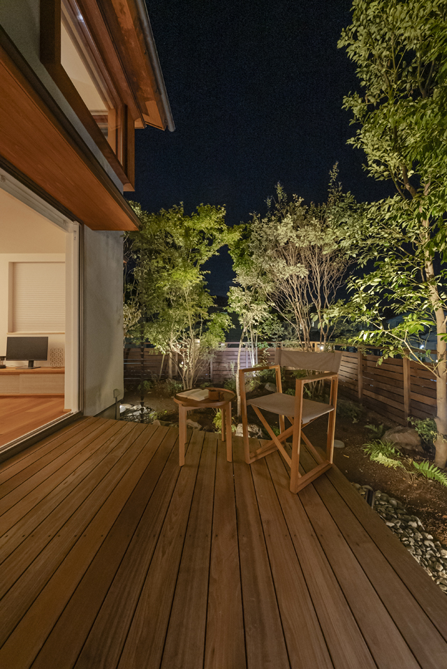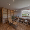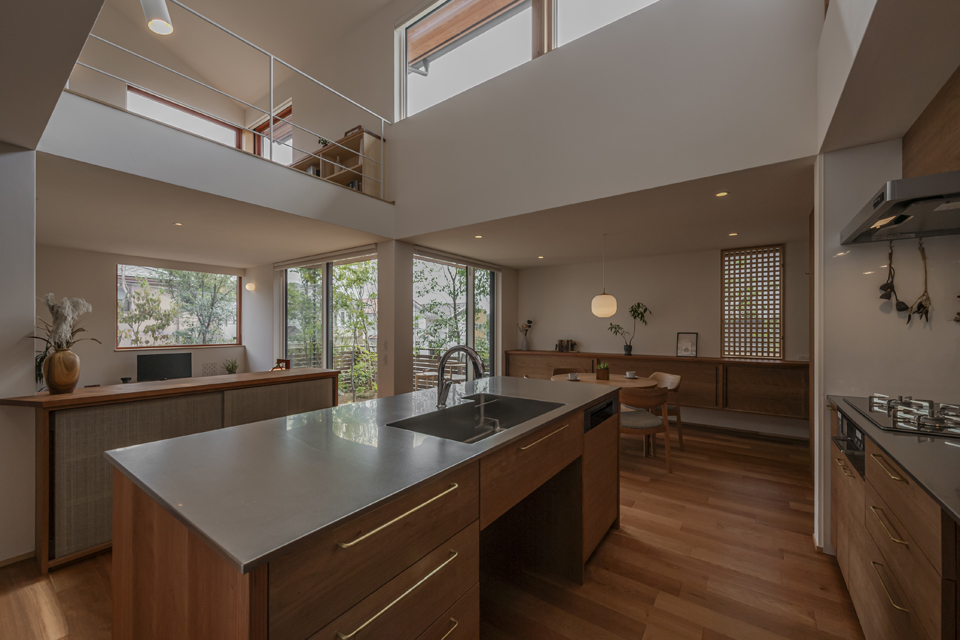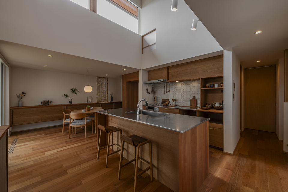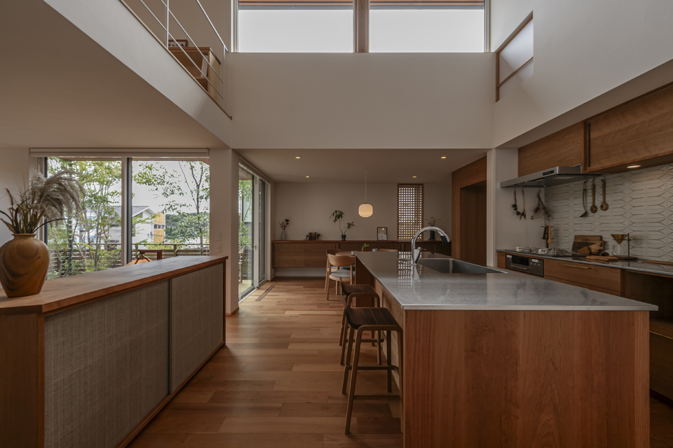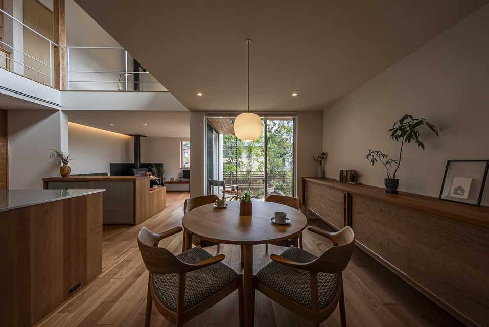 中心となるのは、家族みんなで料理を楽しめるセパレート型の広いアイランドキッチン。上部は大きな吹き抜けとなっており、降り注ぐ光が空間全体を明るく包み込みます。一方で、ダイニングやリビングはあえて天井高を抑えることで、開放感と落ち着きというメリハリのある空間構成を実現しました。特にリビングコーナーは「溜まり」のような落ち着く居場所としてしつらえ、造作ソファに腰掛けながら薪ストーブの炎や雑木庭の景色を愉しむ、贅沢なひとときを演出します。2階へと上がると、そこは趣味と眺望を味わう特別な空間です。見晴らしの良い書斎やセカンドリビングに加え、炉を切った本格的な茶道のお稽古ができるモダンな和室を設けました。壁には調湿・抗菌効果のある中霧島壁、天井にはサツマのヨシベニヤを採用し、他とは一味違う上質な空気が漂います。さらに和室からは南の屋根上の物見台デッキへと出ることができ、星空を見上げたり、豊かな森の緑を眺めたりと、非日常的な時間を過ごすことができます。