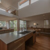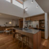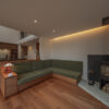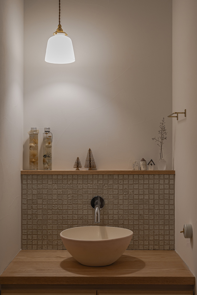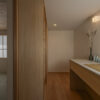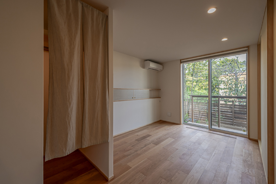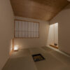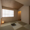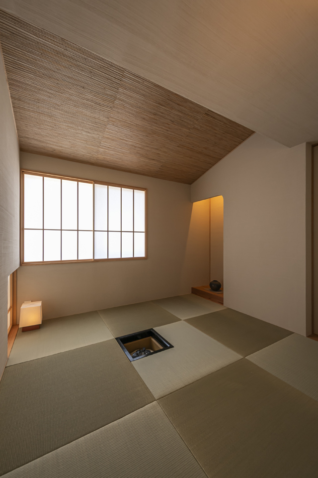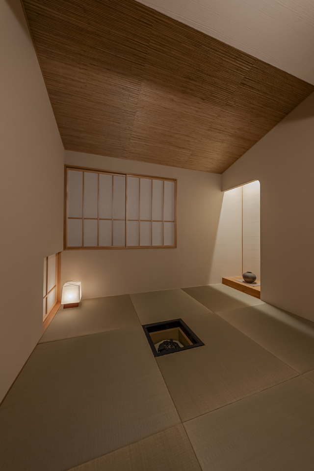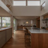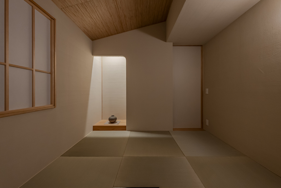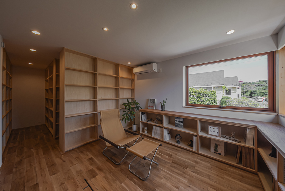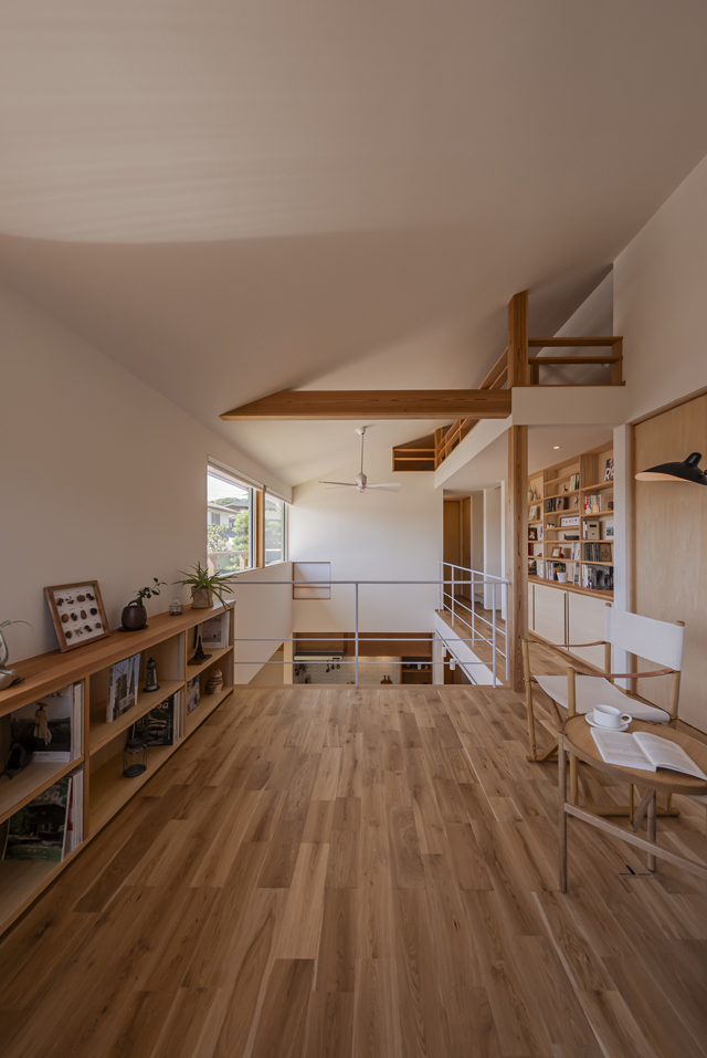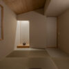 中心となるのは、家族みんなで料理を楽しめるセパレート型の広いアイランドキッチン。上部は大きな吹き抜けとなっており、降り注ぐ光が空間全体を明るく包み込みます。一方で、ダイニングやリビングはあえて天井高を抑えることで、開放感と落ち着きというメリハリのある空間構成を実現しました。特にリビングコーナーは「溜まり」のような落ち着く居場所としてしつらえ、造作ソファに腰掛けながら薪ストーブの炎や雑木庭の景色を愉しむ、贅沢なひとときを演出します。2階へと上がると、そこは趣味と眺望を味わう特別な空間です。見晴らしの良い書斎やセカンドリビングに加え、炉を切った本格的な茶道のお稽古ができるモダンな和室を設けました。壁には調湿・抗菌効果のある中霧島壁、天井にはサツマのヨシベニヤを採用し、他とは一味違う上質な空気が漂います。さらに和室からは南の屋根上の物見台デッキへと出ることができ、星空を見上げたり、豊かな森の緑を眺めたりと、非日常的な時間を過ごすことができます。