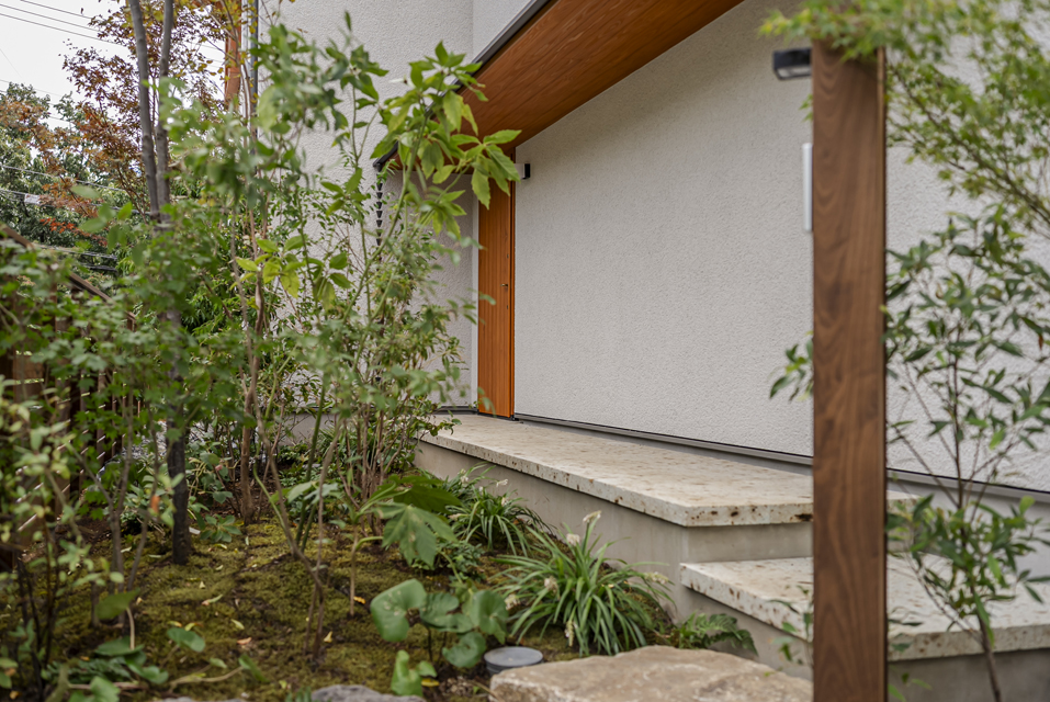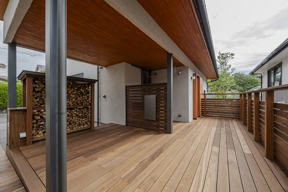 外観は、周囲の景観に配慮し、白色火山灰を掻き落とした「そとん壁」と板張りを組み合わせ、優しく穏やかな佇まいに仕上げています。南西には駐車場から直接アプローチできる屋根付きの広いサービスヤードを設け、雨の日でも快適な裏動線を確保するなど、日々の利便性も大切にしています。