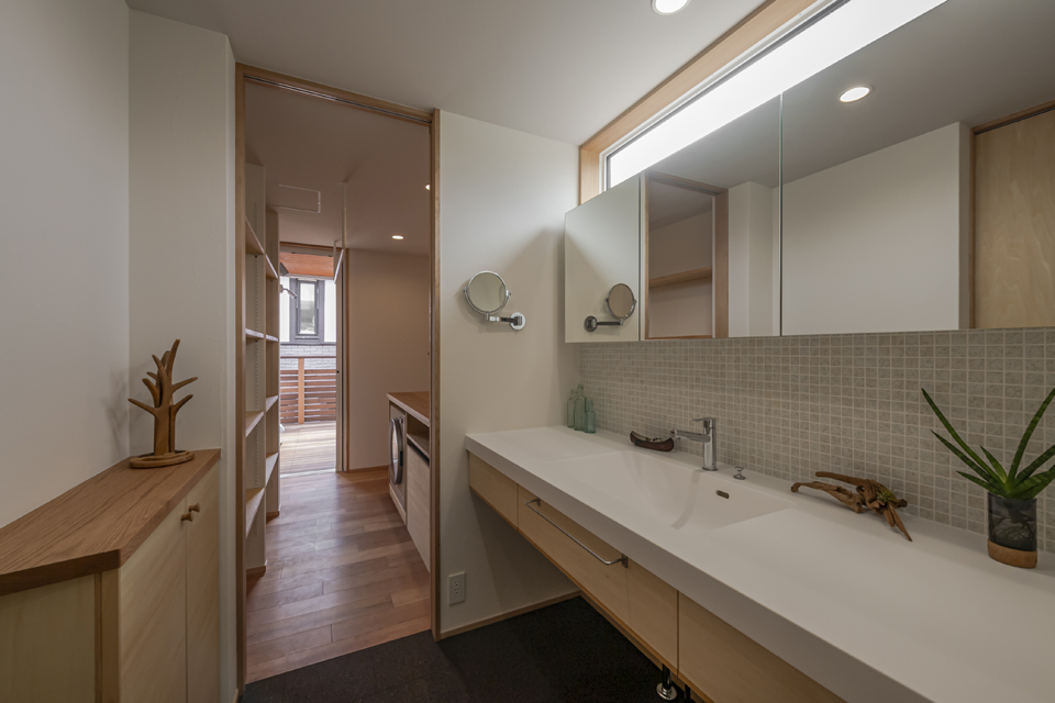 意匠だけでなく、性能面でも安心と快適さを追求しました。長期優良住宅およびBELS認定を取得し、許容応力度計算による耐震等級3、さらには最高等級の耐風性能も備え、災害への備えも万全です。