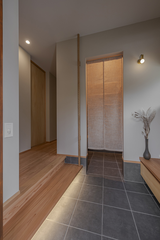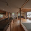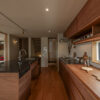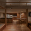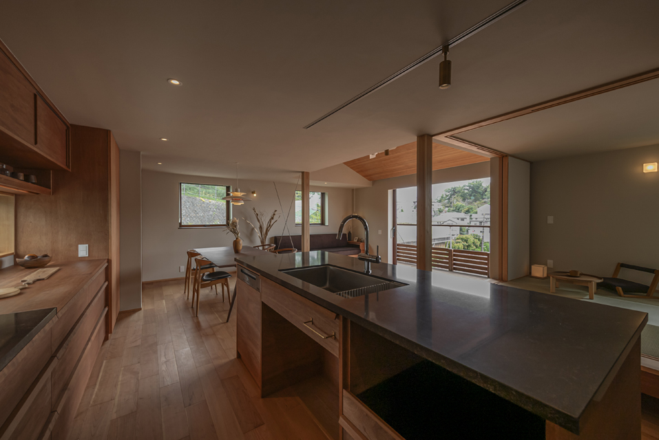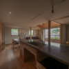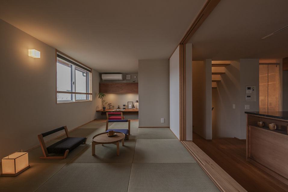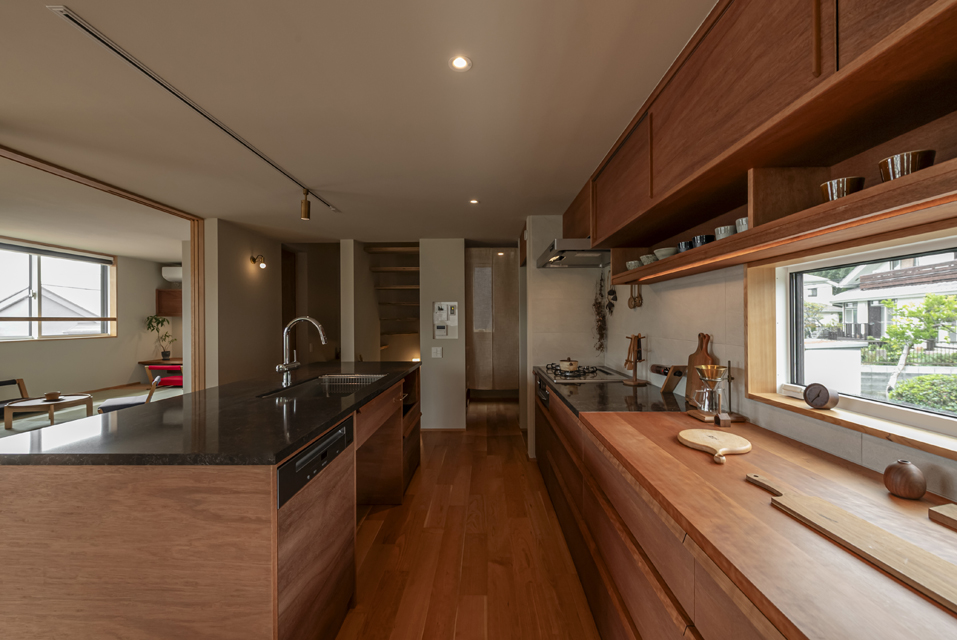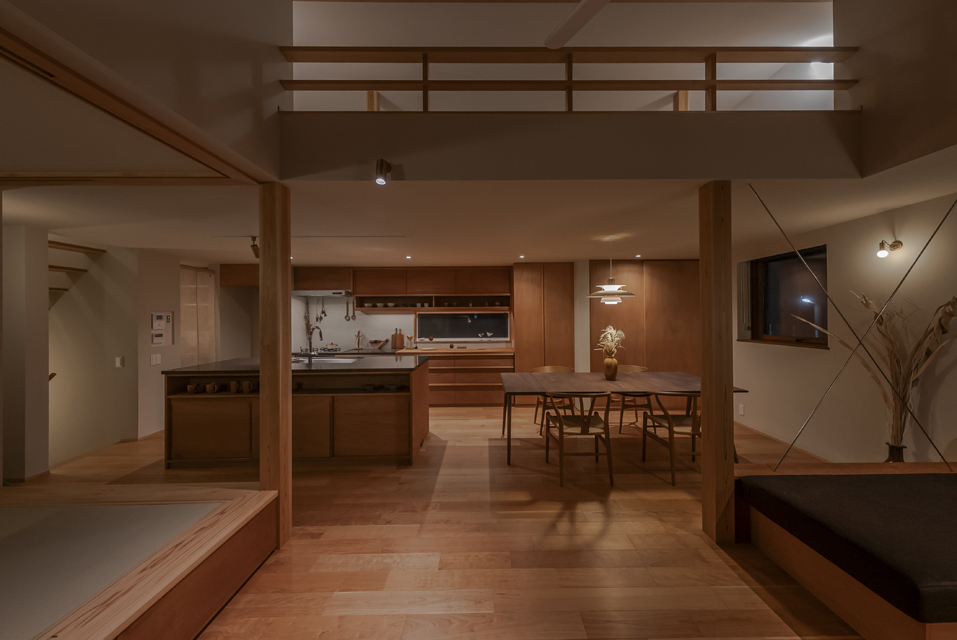 すべてを見渡せる大きなアイランドキッチンを中心に、小上がりの畳コーナーやオリジナル造作ソファを配し、家族や親族が自然と集まり、賑やかに食卓を囲める場をしつらえました。2階の内装材はブラックチェリーの床材や、柿渋塗装を施したラワン材の造作家具で統一し、深みのある落ち着いた雰囲気に仕上げています。