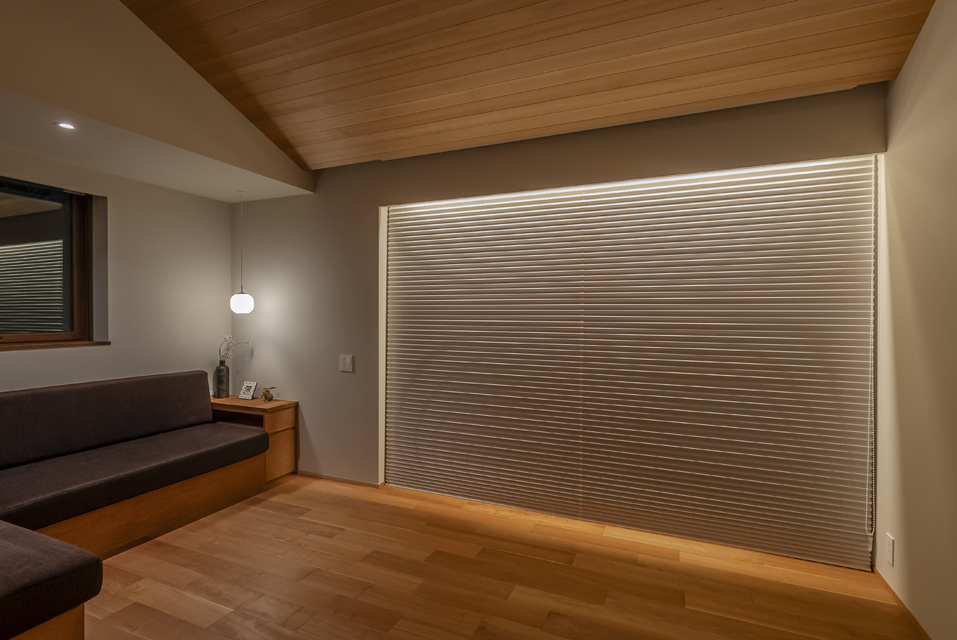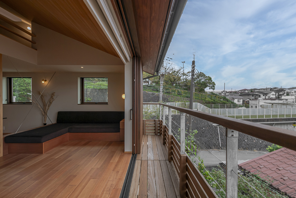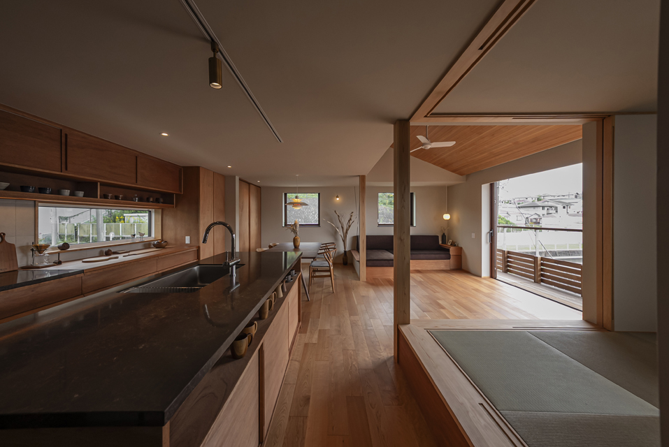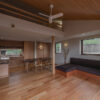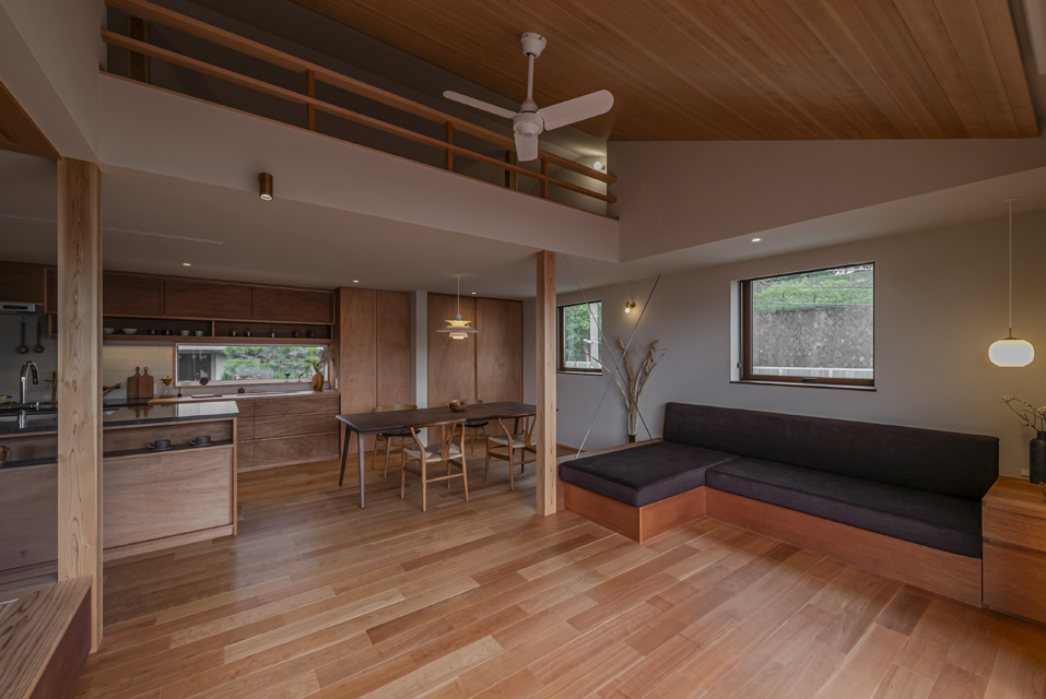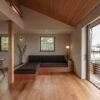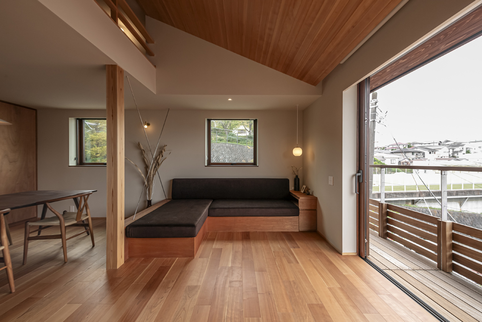 ロフトへとつながる板張りの勾配天井が伸びやかな空間をつくり出し、南側の大きく開け放てる全開口木製サッシからは心地よい風が通り抜け、遠くの景色までもが暮らしの一部となります。