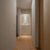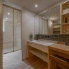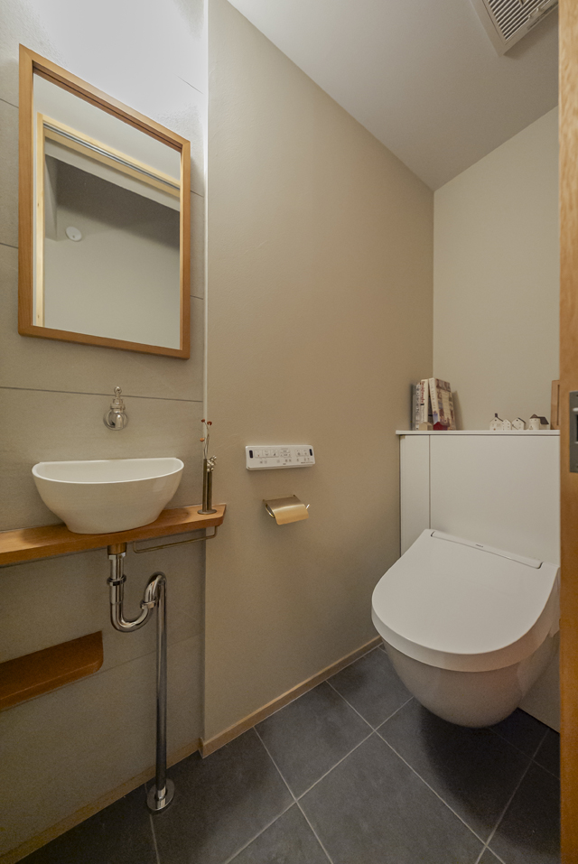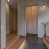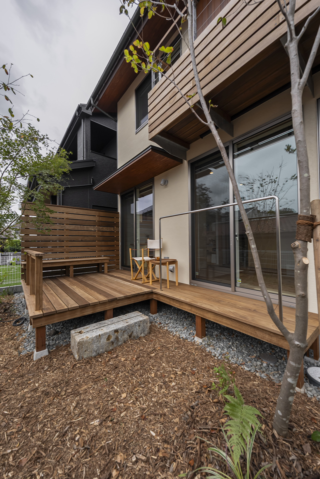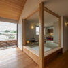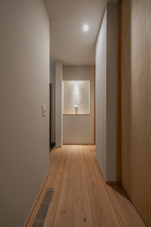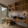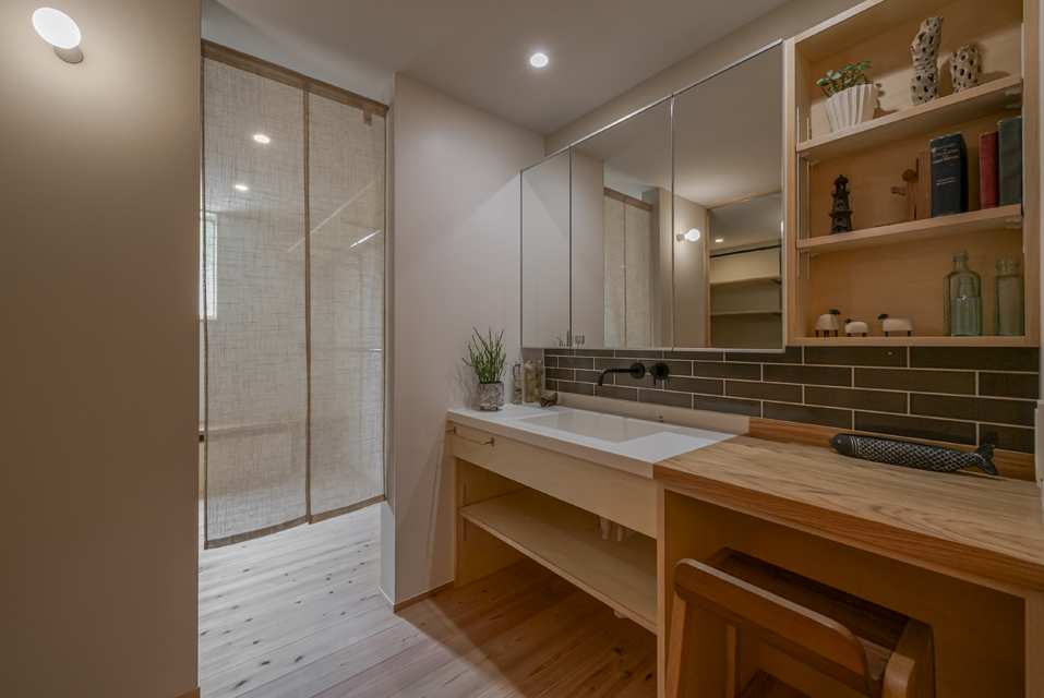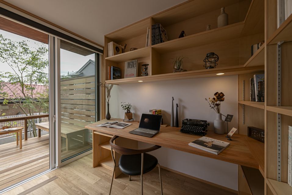 一方、1階は「静」の時間を大切にするプライベートな空間です。寝室や水まわりに加え、リモートワークに集中できる独立した書斎を設けました。南庭につながるデッキ続きの窓から樹々を眺めれば、仕事の合間にも心がふっと解きほぐされます。素材も2階とは対照的に、吉野杉のフローリングやシナ材の造作家具を採用し、やさしく明るい包容力のある空間を演出しました。フロアごとに異なる素材の経年変化を楽しみながら、家族と共に成長していく住まい。意匠だけでなく、長期優良住宅認定や許容応力度計算による耐震等級3、さらには最高等級の耐風性能も備え、長く安心して暮らせる確かな性能も兼ね備えています。